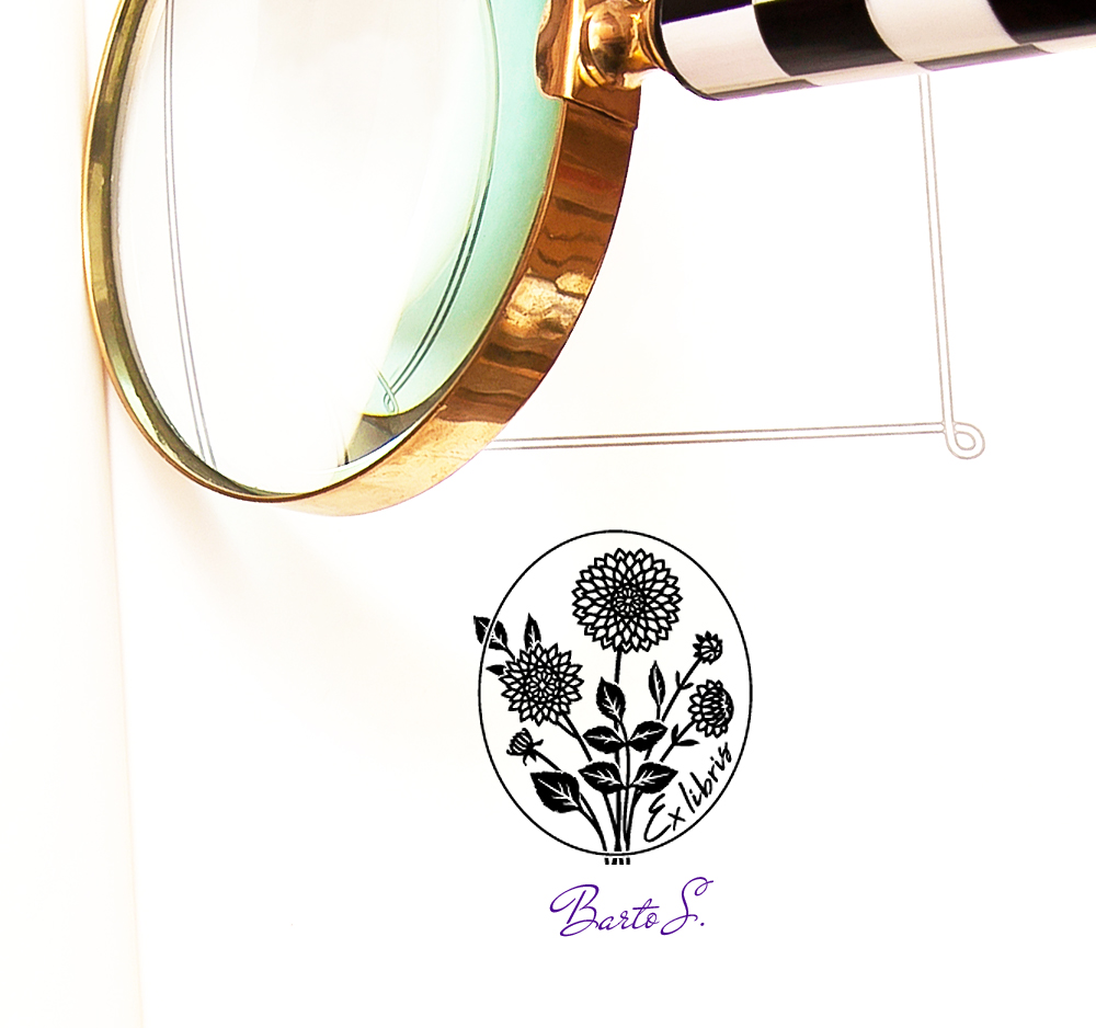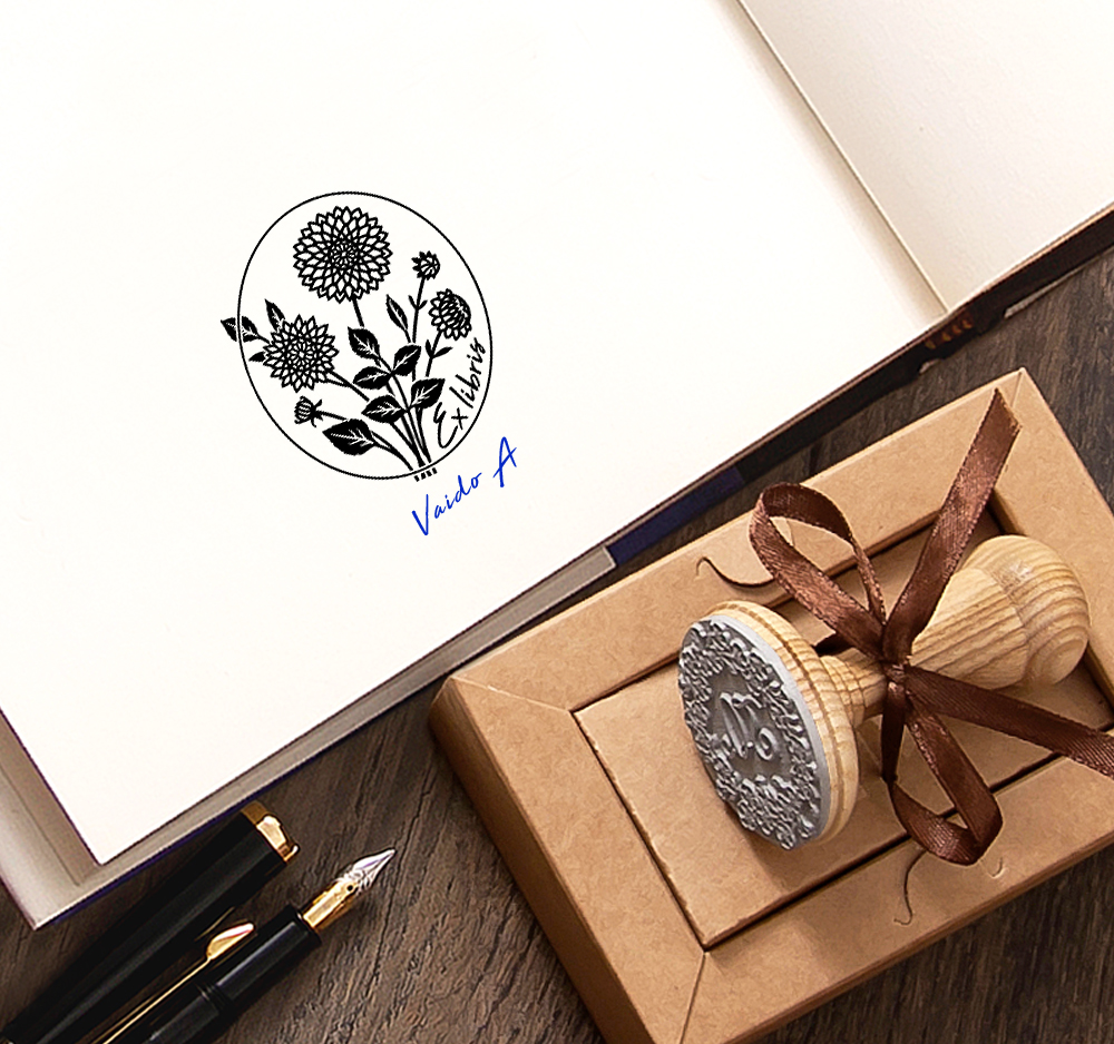 Ex libris su jurginų puokšte – asmeninės bibliotekos knygoms žymėti.