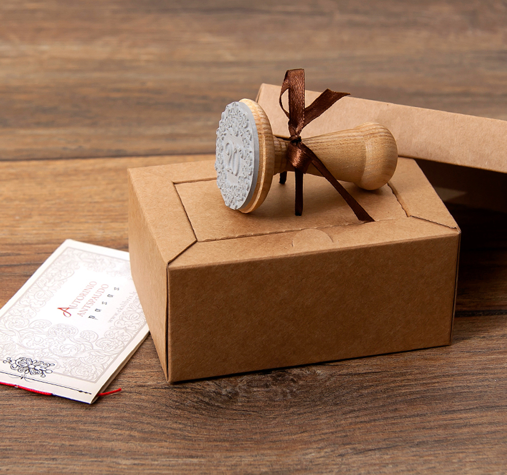 Antspaudas įrištas kaspinėliu dovaninėje rudojo kartono dėžutėje.
