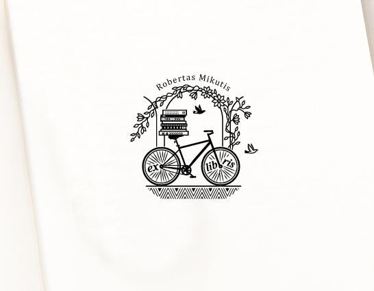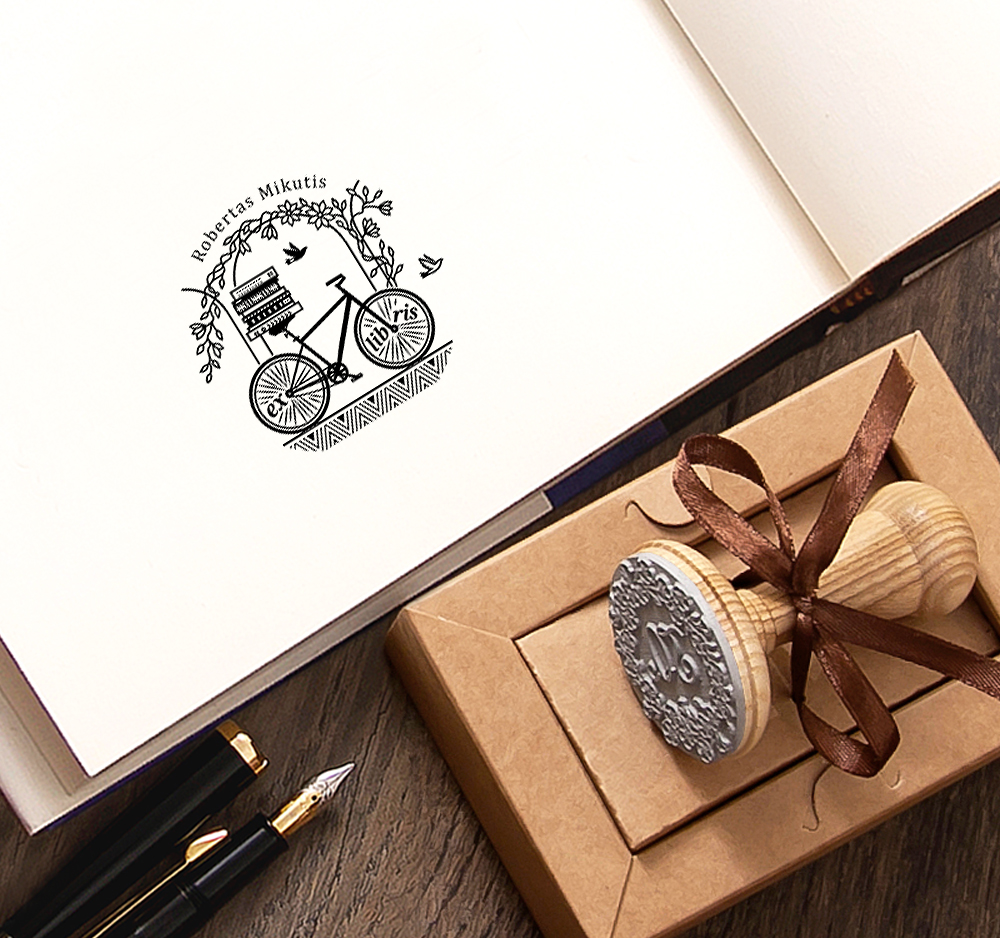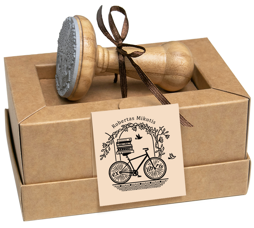 Suasmeninamas vardu ex libris knygoms su miesto dviračiu po vijoklinėmis gėlėmis. Antspaudas įrištas kaspinėliu dovaninėje rudojo kartono dėžutėje ir gali būti dovanojamas iš karto.